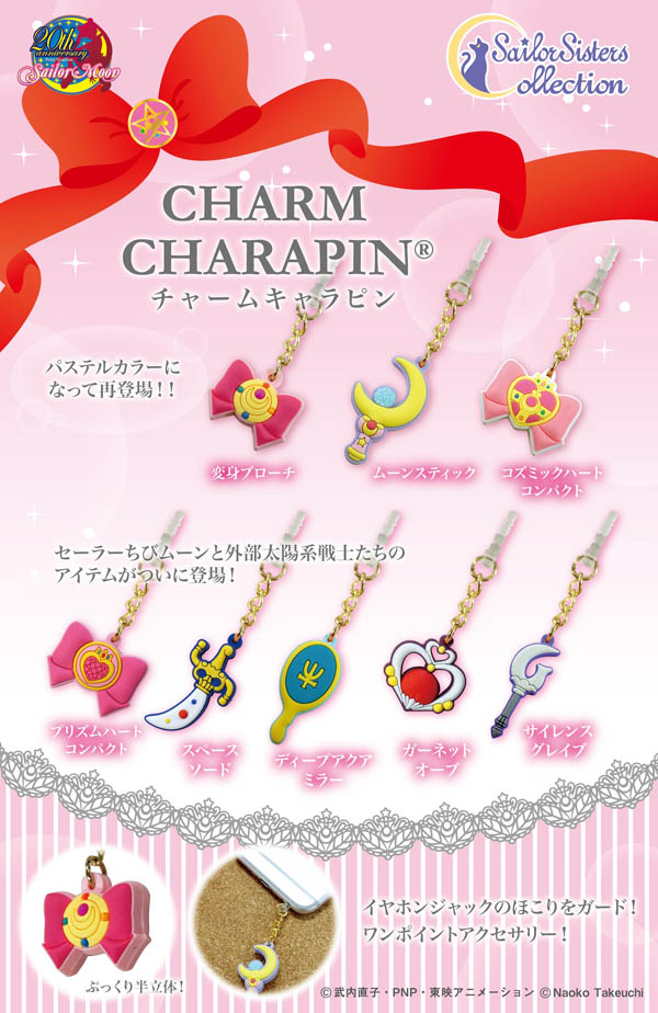 i z serii S oraz Moon Stick. Kolejne 5 to magiczne przedmioty outer senshi oraz kokarda z broszką Sailor Chibi Moon. Zawieszki w sprzedaży pojawią się w maju, cena za sztukę to 680 jenów (ok. 22 zł).