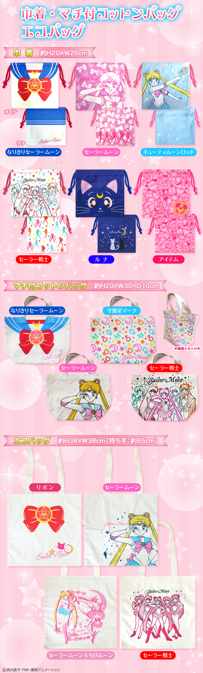 Wśród zapowiedzianych dzisiaj nowości jest szereg toreb i worków bawełnianych. Pierwsze są worki ściągane sznurkiem, mają wymiary 20 x 20 cm i będą dostępne w 6 różnych wzorach: Narikiri Sailor Moon, Sailor Moon, Cutie Moon Rod, Sailor Senshi, Luna i