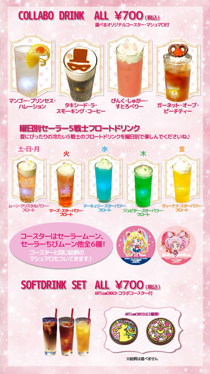 poszczególnym wojowniczkom. W poniedziałek, sobotę i niedzielę będzie to Moon Crystal Power Float, we wtorek, środę, czwartek i piątek będą to odpowiednio Mars/Mercury/Jupiter/Venus Star Power Float. Dodatkowo do innych drinków będą