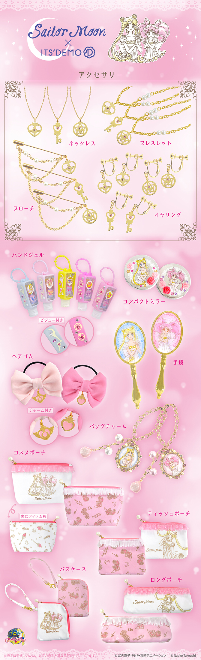 Do ostatniej współpracy z ITS' DEMO dodano sporo nowości, tym razem gadżety również są poświęcone Usagi i Chibiusie. Na początek mamy różne akcesoria w złotym kolorze, w skład których wchodzą naszyjniki, bransoletki, broszki i klipsy. Każde z tych akcesoriów