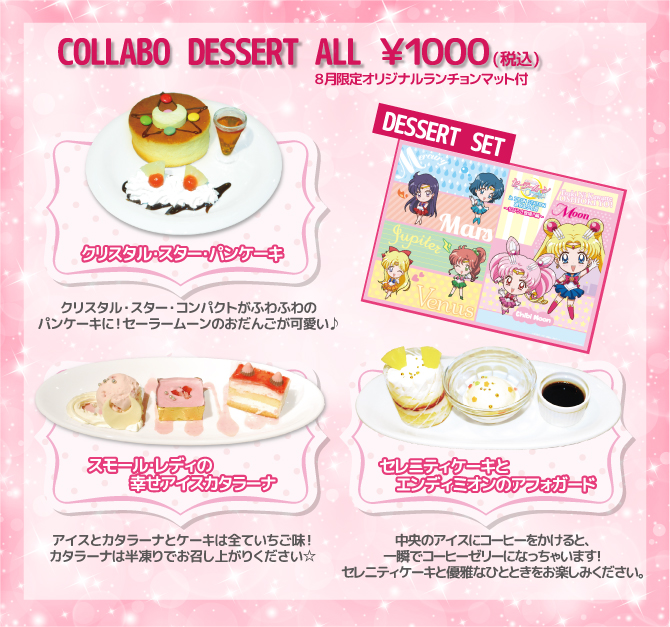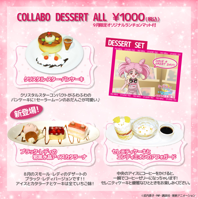 We wrześniu w AniON STATION pojawią się nowe pozycje w menu. Do wyboru będą desery: Crystal Star Pancake, Black Lady no Jakoku Suishou Ice Catalana oraz Serenity Cake to Endymion no Affogato. Desery będą podawane we wrześniu na matach z nowym wzorem z
