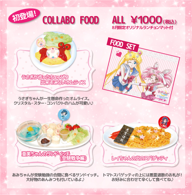 Pojawią się również nowe dania. Do wyboru będą: Usagi Tsukatta Choppiri Dekisounai Omuraisu (omlet, najpopularniejszy wśród dań), Chibiusa ga Choppiri se no Bishite Tsukatta Prism Heart Kanappe (zestaw kanapek), Kiseki no Saigen! Mako-chan no Obento (obento