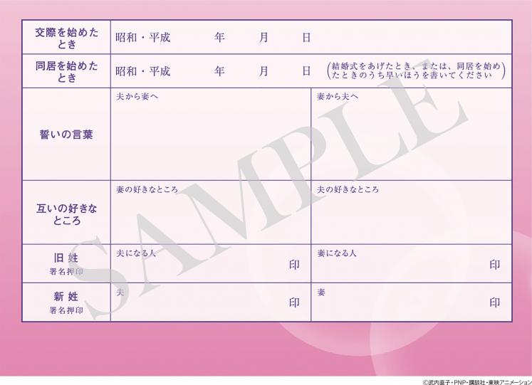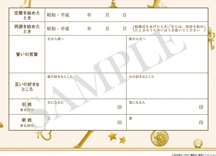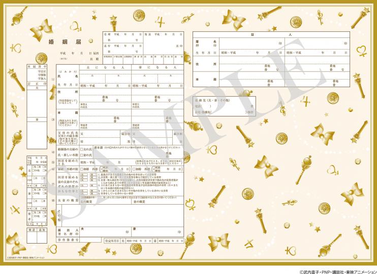 Firma Konin Todoke, zajmująca się wydawaniem formularzy do rejestracji ślubów w Japonii, wyda również formularze ze wzorami z Sailor Moon Crystal. Do wyboru są dwa wzory: Romantic Love (z Sailor Moon) oraz Make Up Princess (z magicznymi przedmiotami).