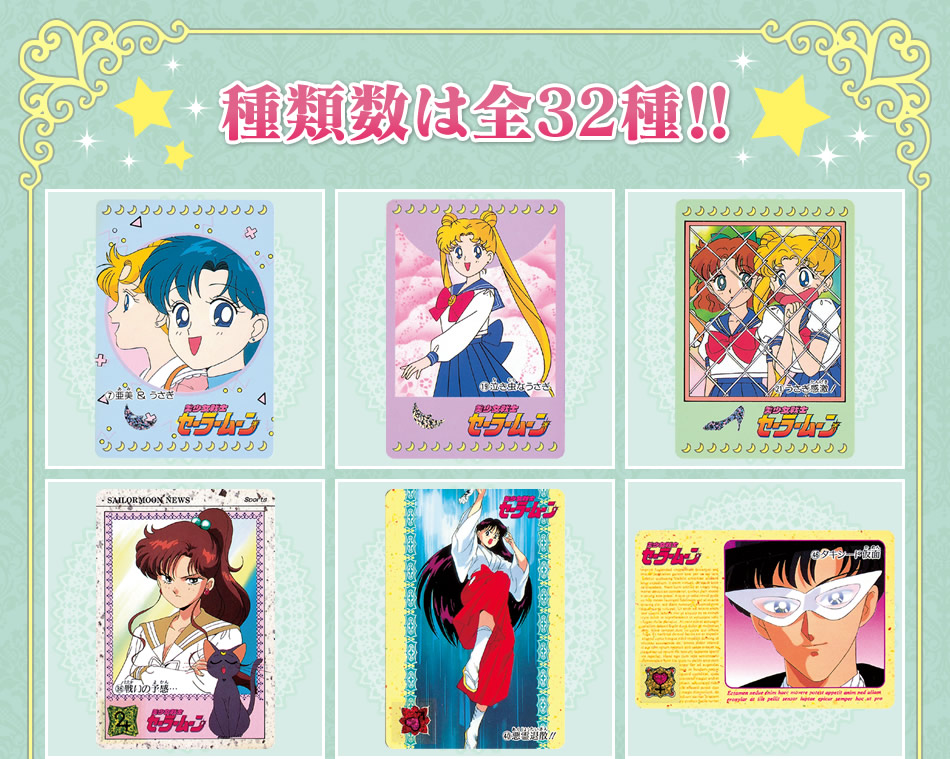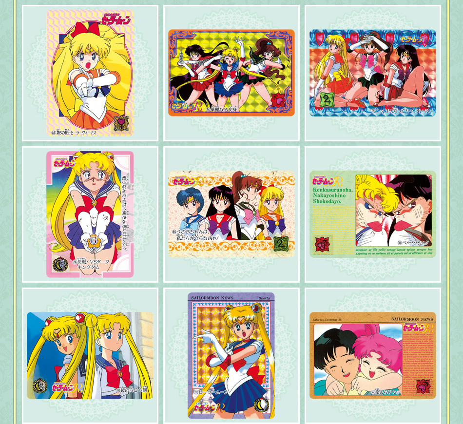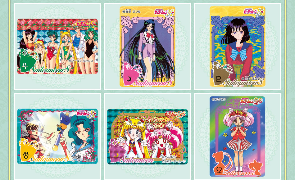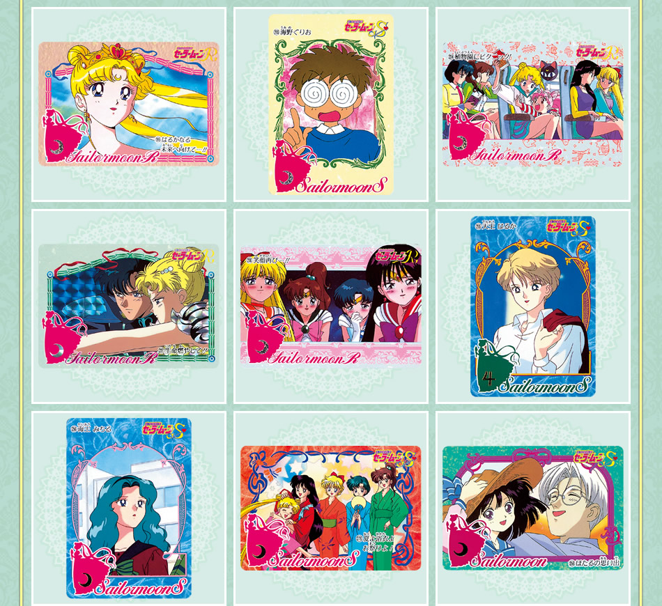 robić po zgięciu klapki z naklejką. Do wyboru są cztery wzory: z inner senshi (w środku jasnoróżowy), z Uranus i Neptune (niebieski w środku), z Pluto, Saturn i Chibi Moon (w środku różowy) oraz z Sailor Starlights (w środku fioletowy).