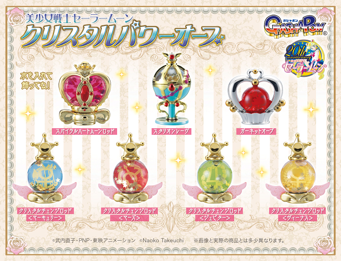 Wśród akcesoriów z automatów gashapon pojawią się metalowe breloki z nadchodzącej drugiej serii Crystal. W zestawie są Space Sword, Deep Aqua Mirror, Garnet Orb, Klucz Czasoprzestrzeni, Srebrny Kryształ Iluzji Chibiusy oraz amulet Hotaru. Cena za kapsułkę