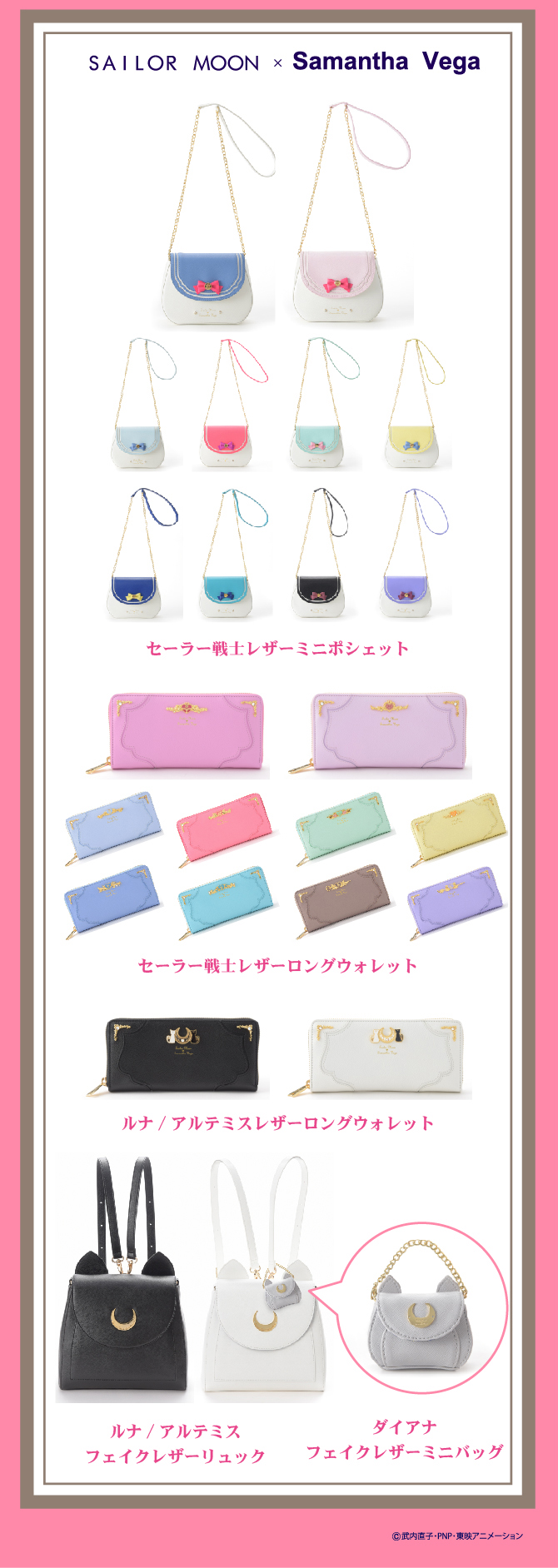 portfeli do wyboru jest aż 12 wariantów kolorystycznych, w kolorach wojowniczek oraz Luny i Artemisa. Portfele mają metalowe ozdoby i ozdobne przeszycia i również są ze skóry. Cena za sztukę to 25920 jenów (ok. 918 zł). Po raz kolejny