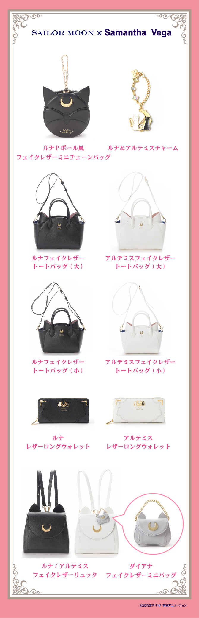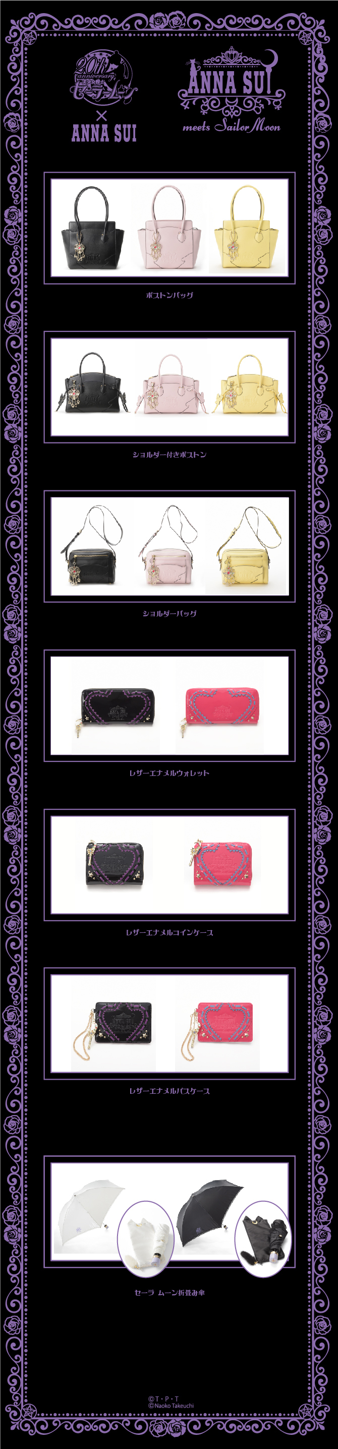 W przypadku współpracy z Anną Sui pokazano nowe produkty. Na początek jest naszyjnik z Luną i Artemisem. Cena to 22680 jenów (ok. 774 zł). Kolejny jest kolczyk z Luną P i zawieszką w kształcie serca. Cena to 11880 jenów (ok. 405 zł). Tym razem pojawił