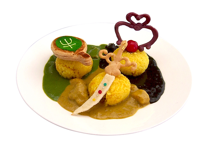 3 Talisman Curry - na talerzu są 3 porcje curry ozdobione trzema talizmanami, curry to curry żółte, ze szpinakiem i z dodatkiem atramentu. Cena 1450 jenów (ok. 49 zł).