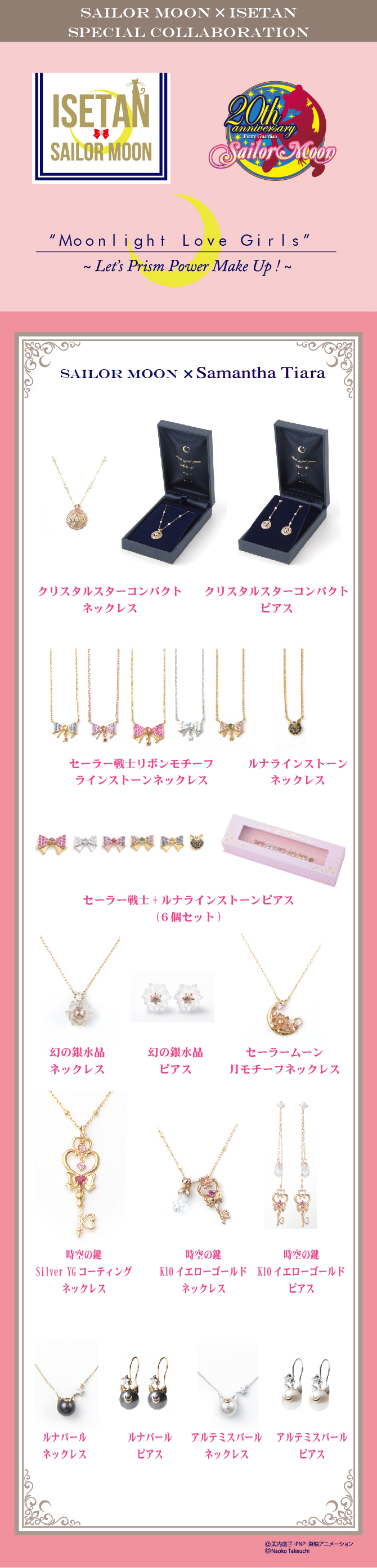 w cenie 38880 jenów (ok. 1329 zł). Na koniec mamy naszyjniki i kolczyki z pereł w motywach Luny i Artemisa. Biżuteria jest wykonana z 10-karatowego białego i żółtego złota oraz ze szklanych pereł i ozdobiona cyrkoniami. Perły