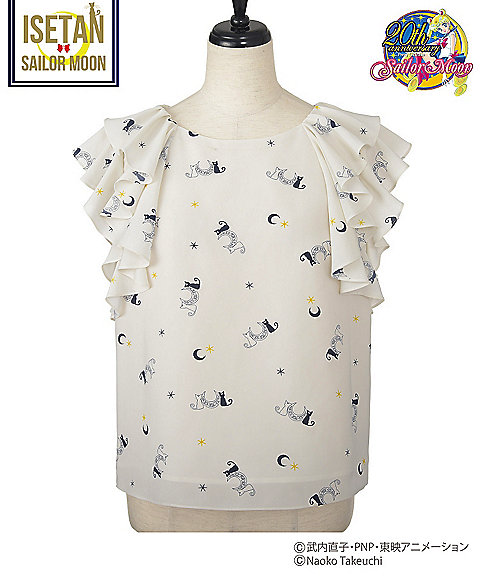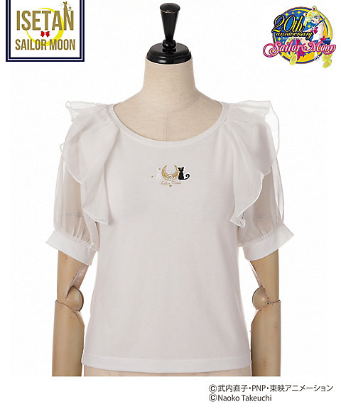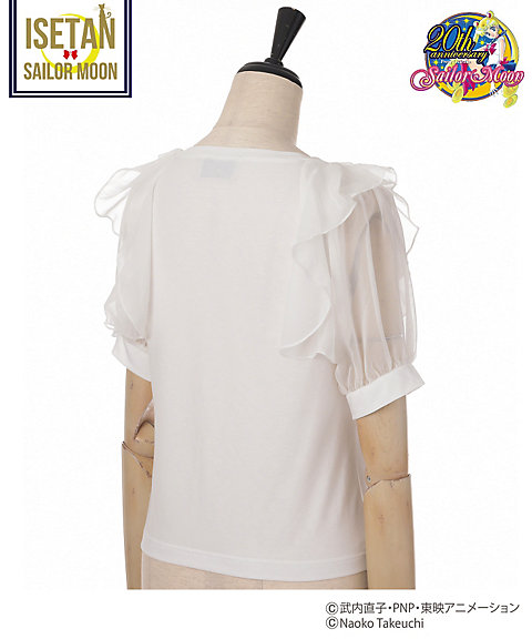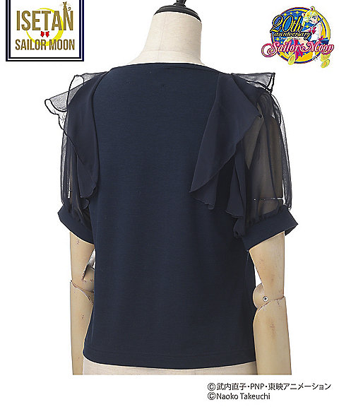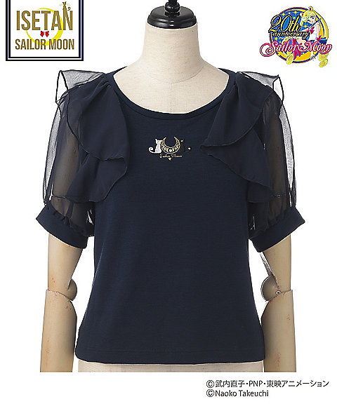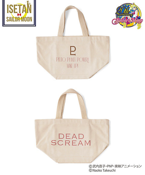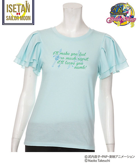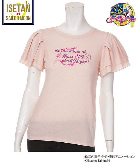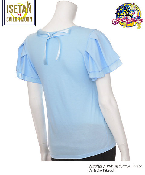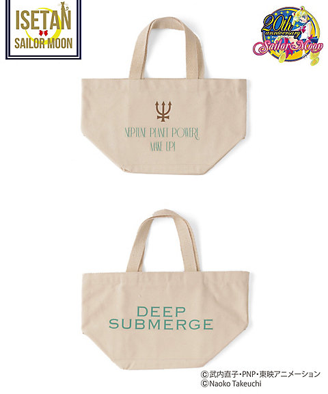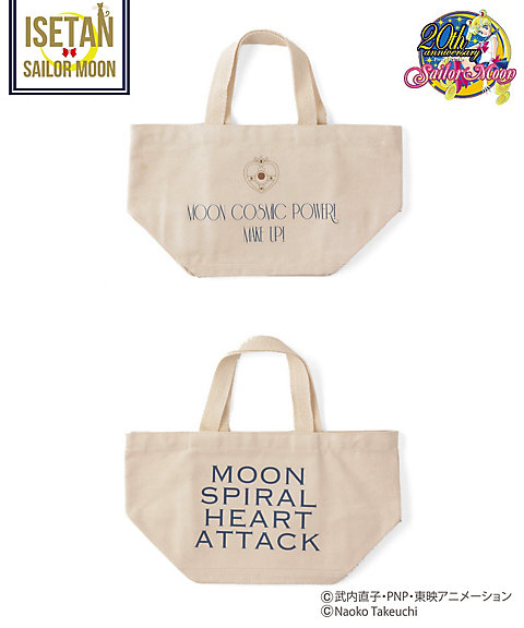 krótki falbankowy rękaw, z przodu mają nadruk z przemową danej wojowniczki po angielsku, a z tylu przy szyi kolorową wstążeczkę zawiązaną w kokardę. Dostępne w 5 kolorach inner senshi. Cena za sztukę to 9720 jenów (ok. 329 zł). Zostały jeszcze torby materiałowe. Z jednej strony mają nadrukowane słowa przemiany i magiczne przedmioty danej wojowniczki, a z drugiej słowa ataku. Dostępne są wzory z inner senshi, outer senshi oraz Chibi Moon. Cena za sztukę to