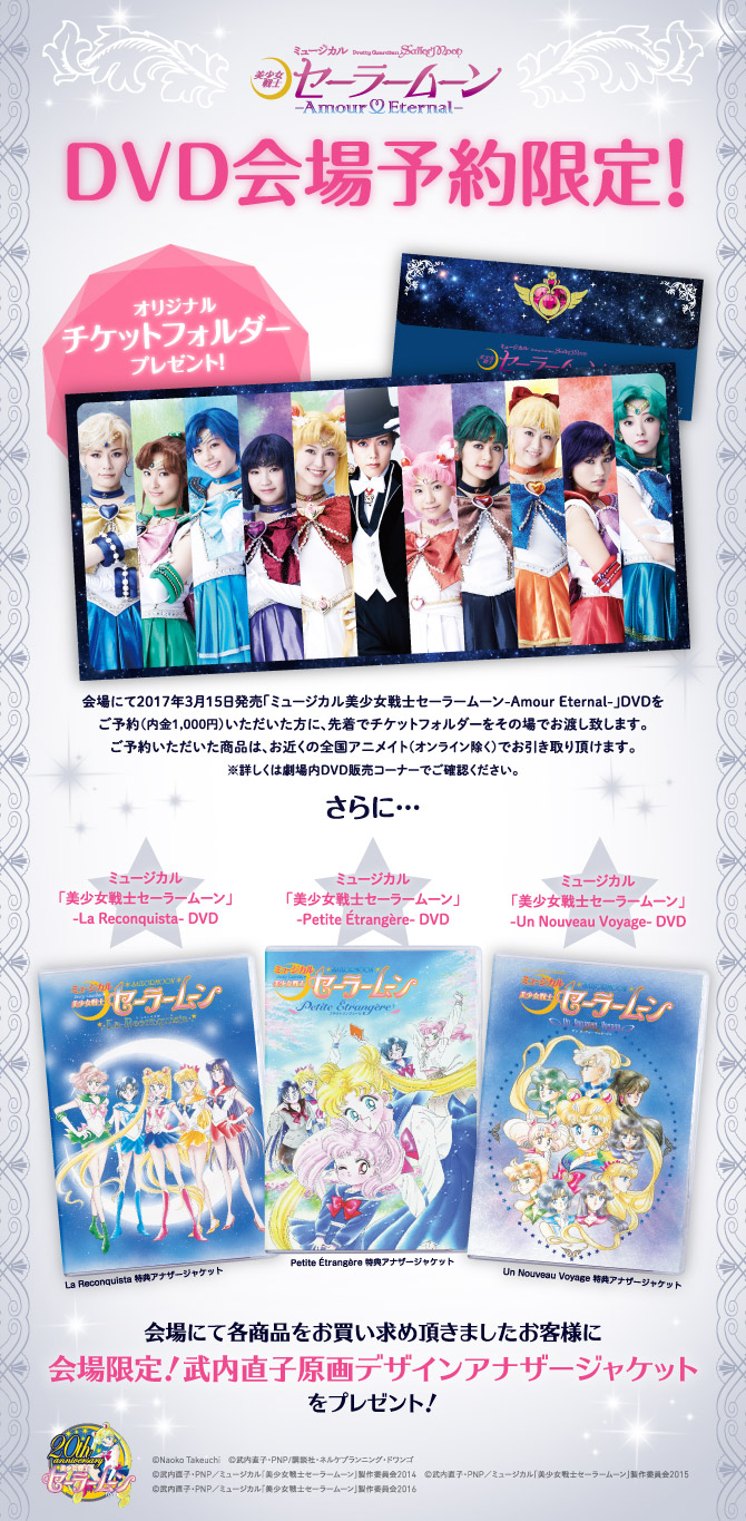 DVD z najnowszym musicalem pojawi się w sprzedaży 15 marca 2017. Podczas wystawiania nowego przedstawienia będzie można również zdobyć dodatkowe okładki do poprzednich wydań DVD z ilustracjami Naoko Takeuchi.