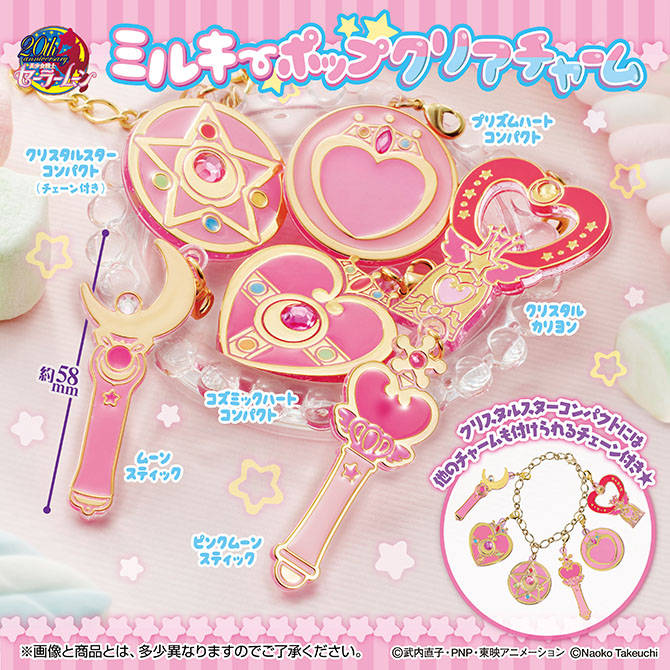 W automatach gashapon pojawią się w tym miesiącu zawieszki Milky Pop. W międzyczasie od zapowiedzi zmieniły z nazwę z Acrylic na Clear. Zawieszka Moon Stick jest najdłuższa i ma 58 mm, Pink Moon Stick ma 57 mm, a reszta zawieszek 40 mm.