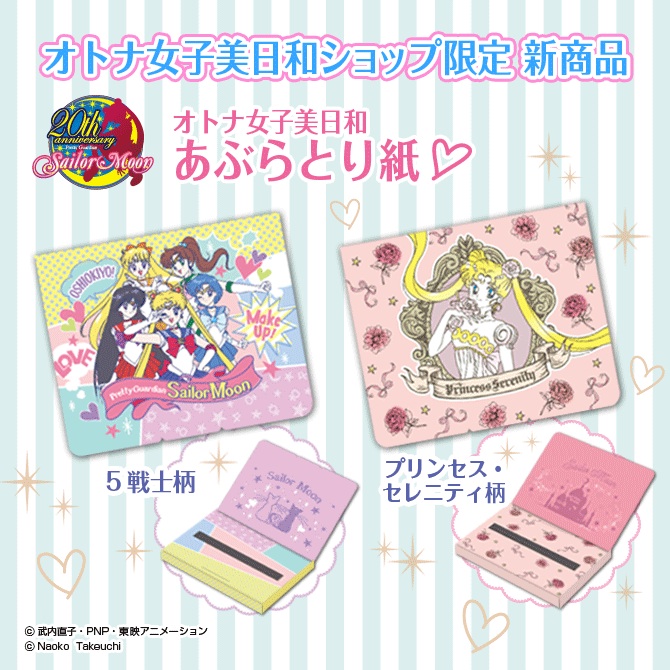 W sklepie pojawią się bibułki matujące, które poprzez delikatne dociśnięcie do skóry twarzy wchłaniają nadmiar sebum, makijażu lub tłuszczu. Do wyboru dwa wzory opakowań: pięć wojowniczek oraz Księżniczka Serenity. Cena to 540 jenów za opakowanie (ok.21