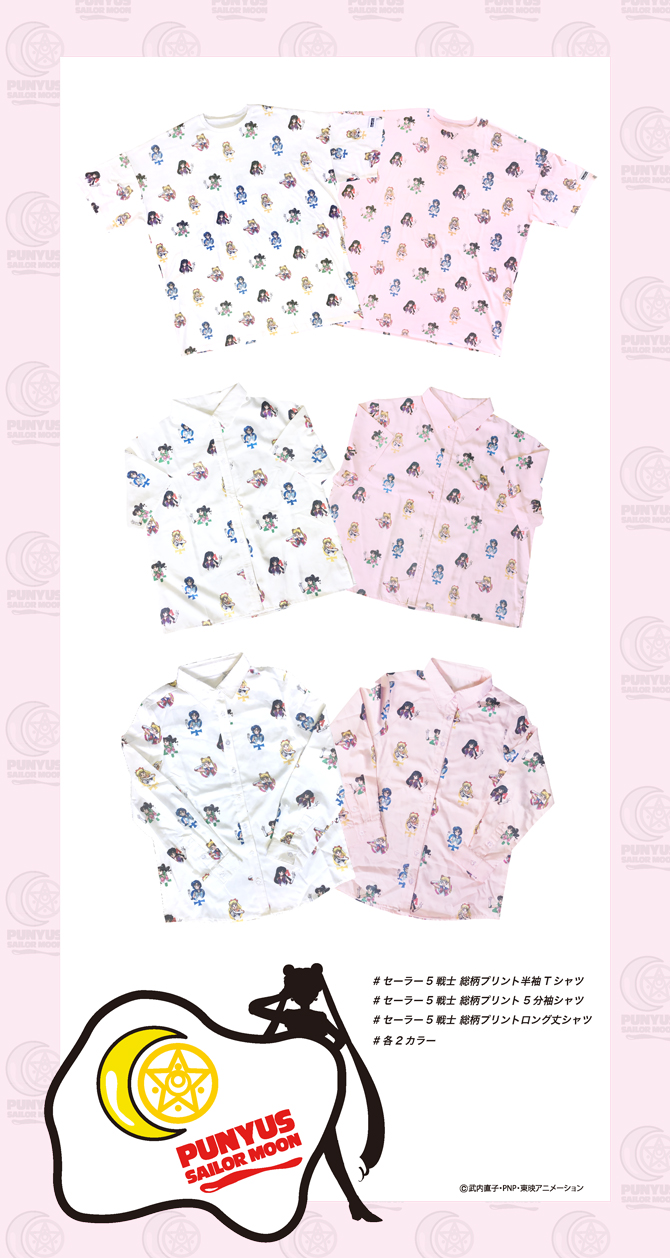 - podkoszulki i koszule z krótkim i długim rękawem - wszystkie w kolorach białym i różowym z nadrukami inner senshi, podkoszulki kosztują 3990 jenów (ok. 144 zł) za sztukę, koszule z krótkim i długim rękawem 6990 jenów (ok. 253 zł) za sztukę.