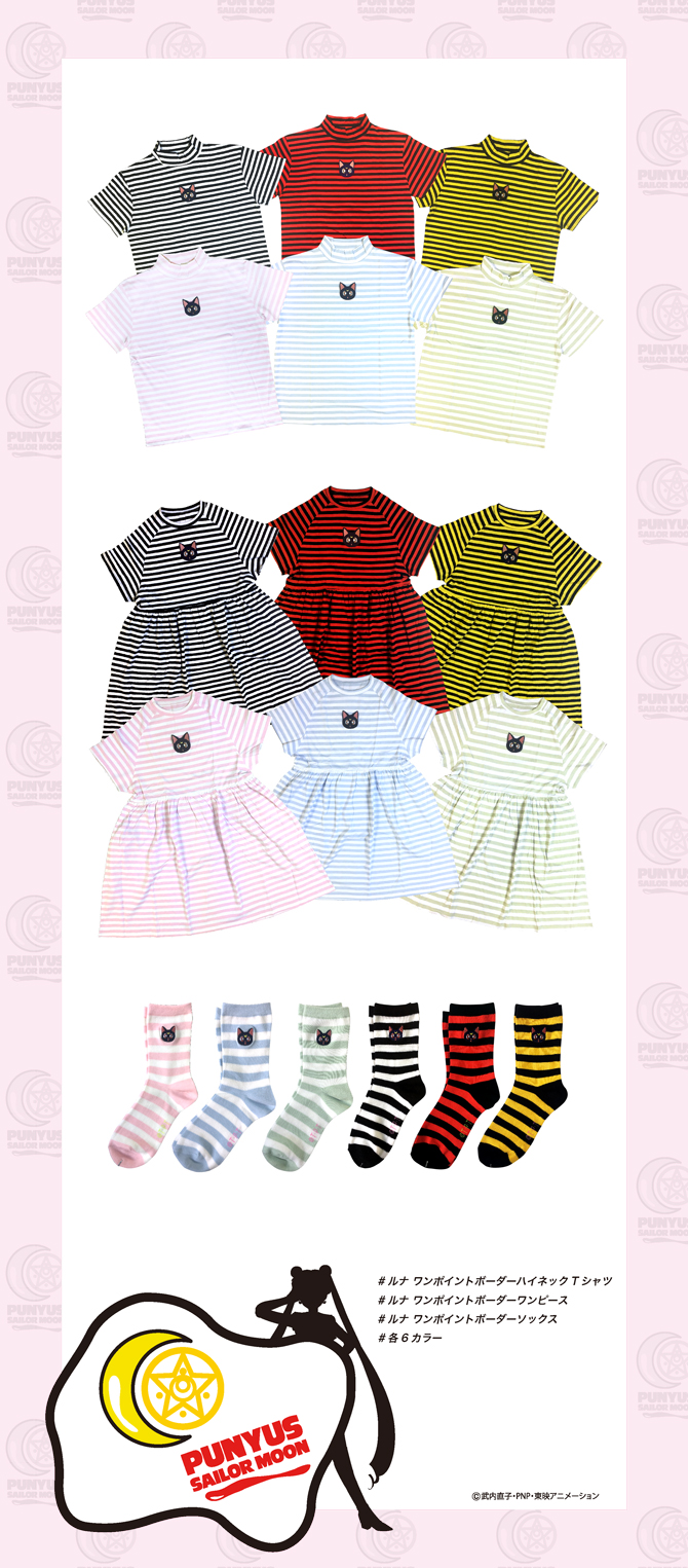 - koszulki, sukienki i skarpetki w paski - wszystkie mają wyszytą głowę Luny, do wyboru 6 kolorów: różowy, niebieski, szary, czarny, czerwony i żółty, koszulki kosztują 3990 jenów (ok. 144 zł) za sztukę, sukienki 4990 jenów (ok. 181 zł) za sztukę, a skarpetki