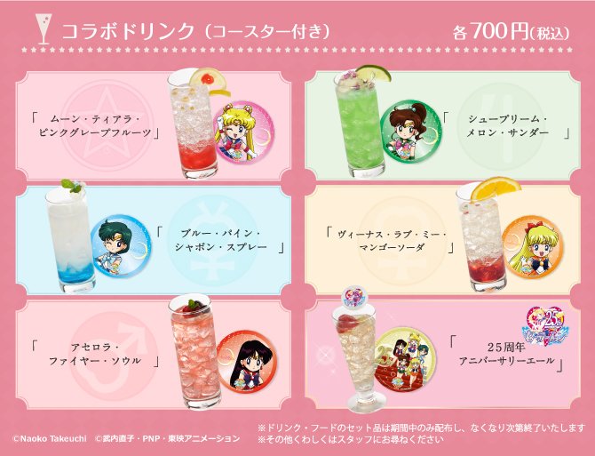 W ofercie kawiarni pojawi się 6 drinków: Moon Tiara Pink Grapefruit, Blue Pineapple Shabon Spray, Acerola Fire Soul, Supreme Melon Thunder oraz Venus Love Mango Soda. Wszystkie w cenie 700 jenów (ok. 25 zł).