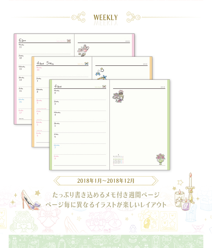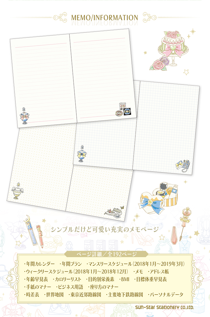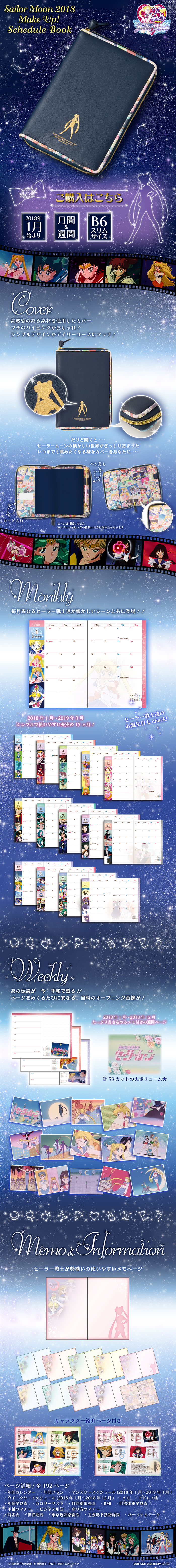 Zapowiedziano wydanie kalendarzy z planerami na 2018 rok. Do wyboru są dwa wzory, Sailor Moon i Księżniczka Serenity, w kolorach granatowym i białym. Oba w formacie B6 oraz ozdobnej okładce zapinanej na zamek błyskawiczny. W środku uchwyt na długopis. Planery mają po 192 strony i zawierają kalendarze miesięczne od stycznia 2018 do marca 2019 oraz tygodniowe od stycznia do grudnia 2018. W kalendarzu Sailor Moon pojawiają się sceny ze starej serii, a w Księżniczce Serenity rysunki z kosmetykami, biżuterią i innymi akcesoriami. Przedsprzedaż rozpoczyna się dzisiaj, a wysyłka nastąpi w listopadzie. Cena za sztukę to 3942 jeny (ok. 129 zł).