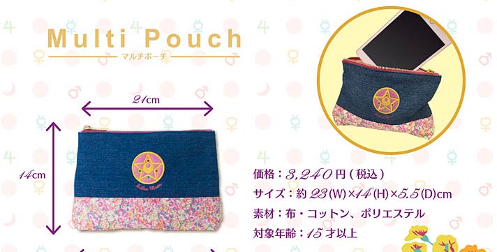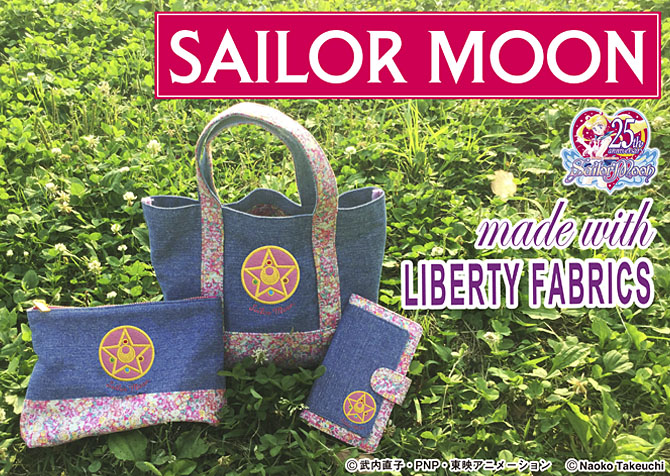 Następna współpraca nastąpi z Liberty Fabrics, w sprzedaży pojawią się torba na pojemnik na drugie śniadanie, etui na smartfona oraz kosmetyczka. Torba ma wymiary 30 x 33,5 x 10 cm, etui 8,5 x 15 x 1 cm, a kosmetyczka 23 x 14 x 5,5 cm. Wszystkie wykonane są z niebieskiego denimu i wzorzystego materiału, ozdobione wyszytą broszką Crystal Star. Torba kosztuje 4320 jenów (ok. 141 zł), etui 4860 jenów (ok. 158 zł), a kosmetyczka 3240 jenów (ok. 106 zł). Przedsprzedaż rozpoczyna się dzisiaj, a wysyłka nastąpi we wrześniu.