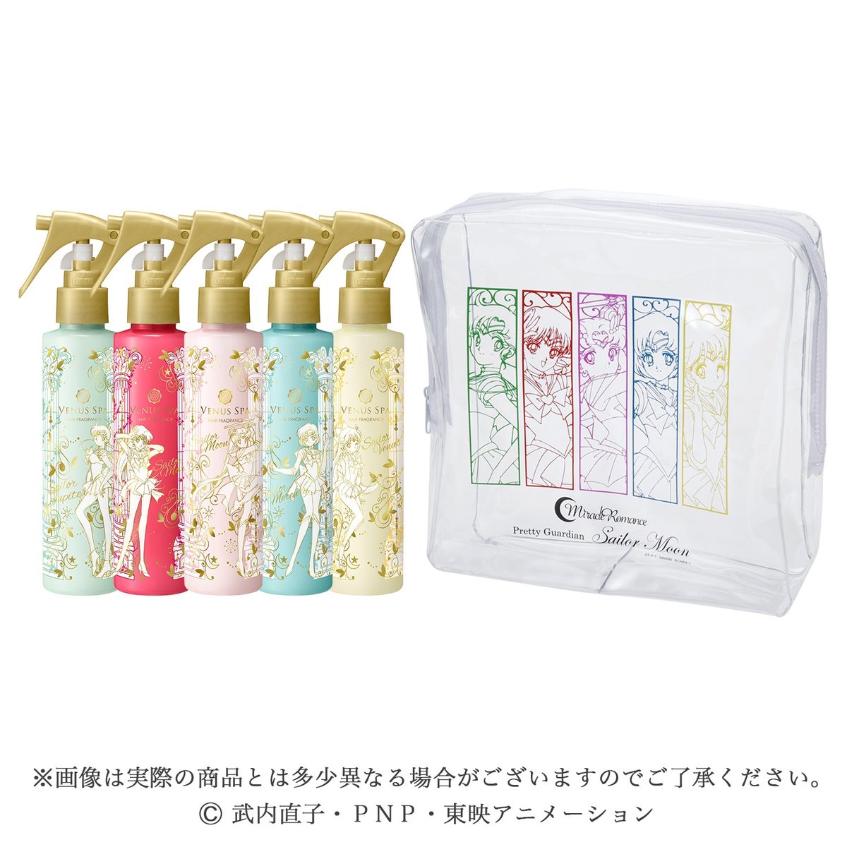 Dzisiaj podano szczegółowe informacje na temat perfum do włosów, które zostały zapowiedziane w marcu. W ofercie pojawi się 5 butelek inspirowanych inner senshi. Perfumy Sailor Moon mają zapach kwiatów i brzoskwini, Sailor Mercury białej herbaty i orchidei, Sailor Mars róży i białych kwiatów, Sailor Jupiter zielonej róży i jaśminu, a Sailor Venus śliwki i słodkiego osmanthusa. Kosmetyki zawierają również liczne związki do pielęgnacji włosów. Spryskiwacz o pojemności 150 mL będzie kosztować 1296 jenów (ok. 43 zł). Dzisiaj rozpoczyna się też przedsprzedaż na cały zestaw zawierający 5 butelek i przezroczystą kosmetyczkę do przechowywania butelek w cenie 7182 jenów (ok. 236 zł). Wysyłka nastąpi w sierpniu.