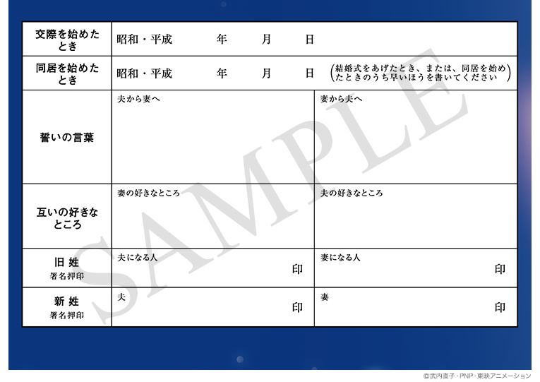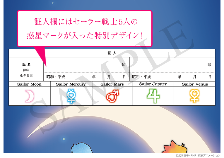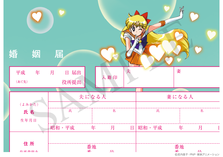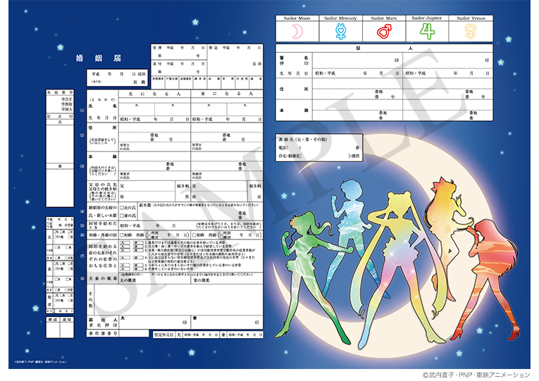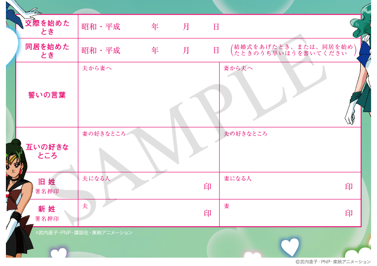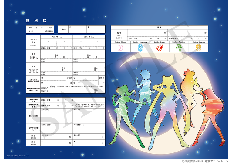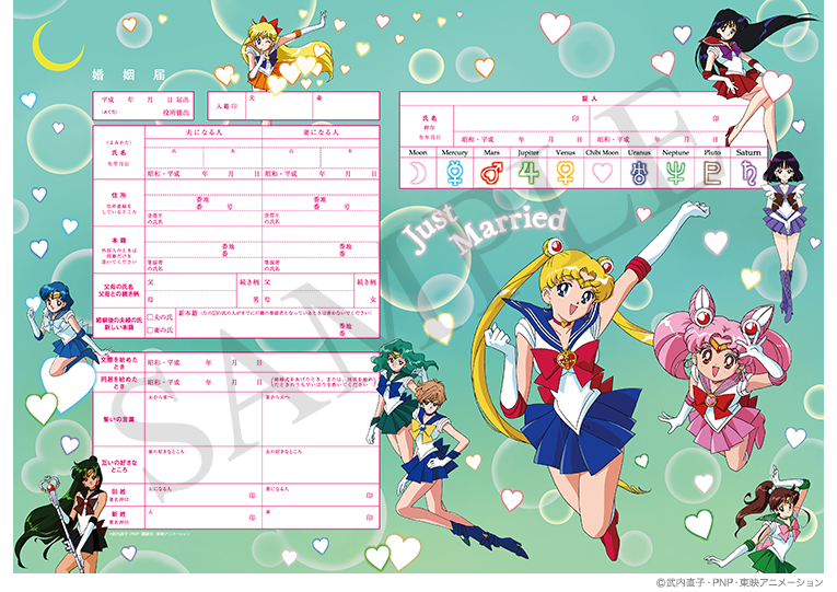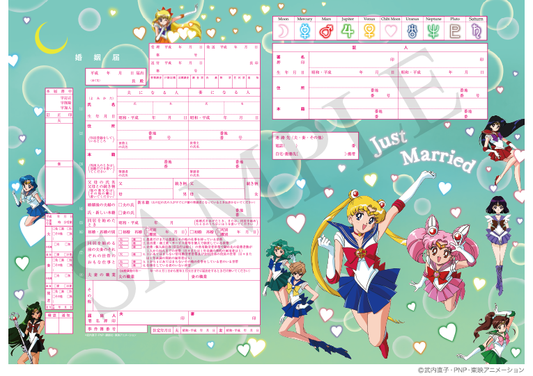 Pojawiły się dwa nowe wzory formularzy ślubnych. Do kupienia dostępne są od wczoraj, cena to 3000 jenów za wzór (ok. 97 zł). Do wyboru wzory: Sailor Moon Moon Prism Power oraz Sailor Moon Love Message.
