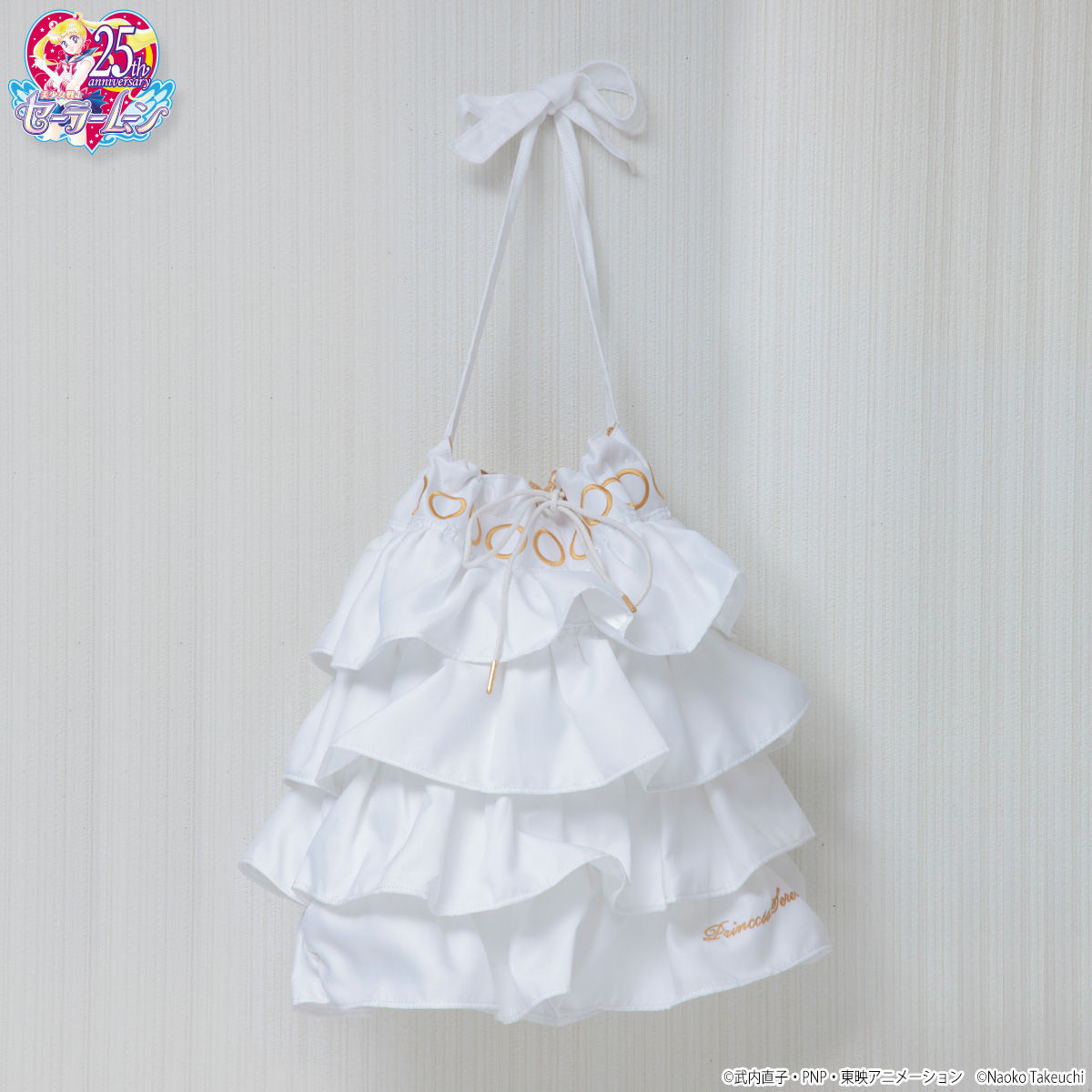 W sprzedaży pojawią się torby typu worek z falbankami, inspirowane Księżniczką Serenity i Czarną Damą. Biała torba jest ozdobiona haftem, a czarna naszytymi sztucznymi kryształkami. Torby mieszczą format A4. Wymiary to 41 x 37 cm. Przedsprzedaż rozpoczyna