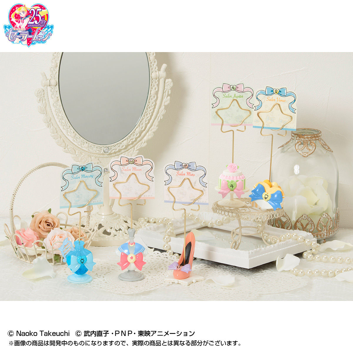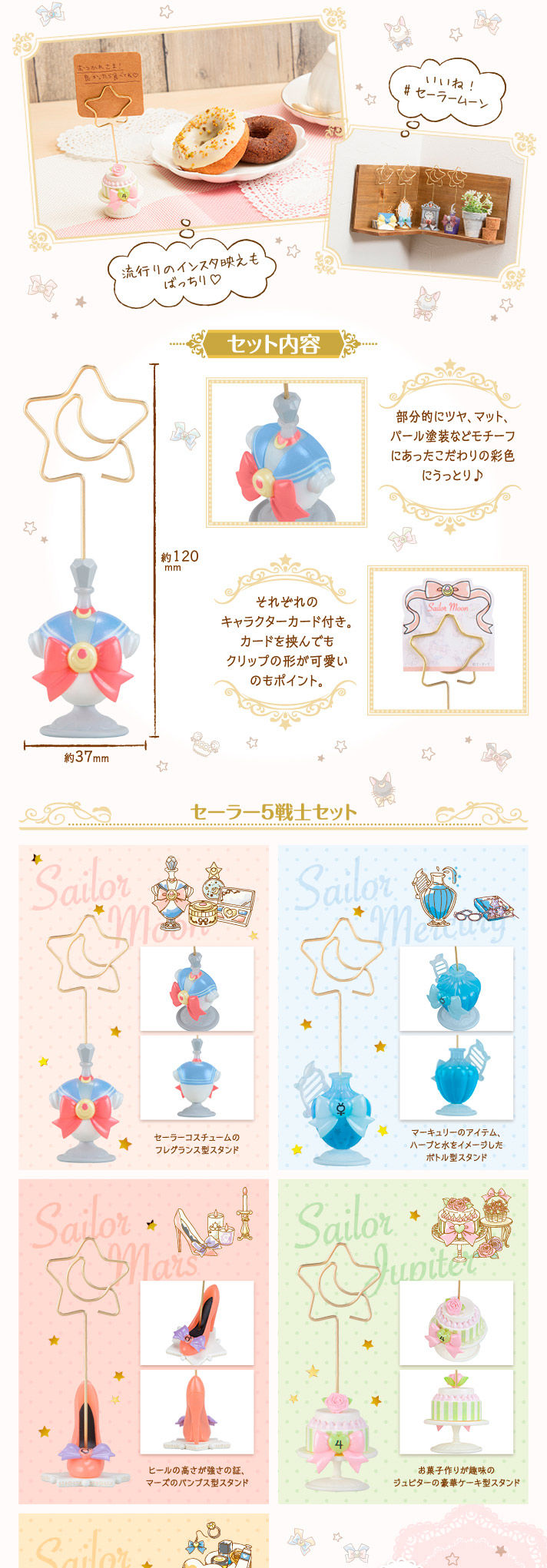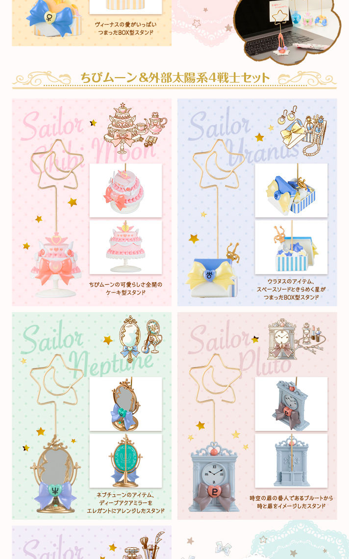 5 stojaków inspirowanych inner senshi lub Chibiusą i outer senshi. W zestawie stojaki oraz ozdobne mini karteczki. Stojaki mają około 120 mm wysokości, a karteczki mają wymiary 50 x 50 mm. Cena za zestaw to 7020 jenów. Przedsprzedaż