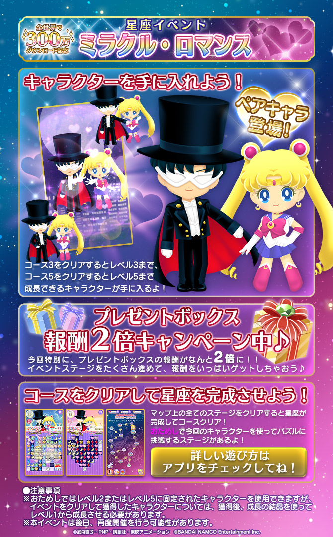 Kolejny event pod nazwą Miracle Romance pojawi się z okazji świętowania 3 milionów pobrań gry na całym świecie. Poziomy eventu będą rozłożone na 6 plansz, zazwyczaj jest ich 5. Po raz pierwszy będzie można zdobyć parę postaci, Sailor Moon i Tuxedo Kamen.