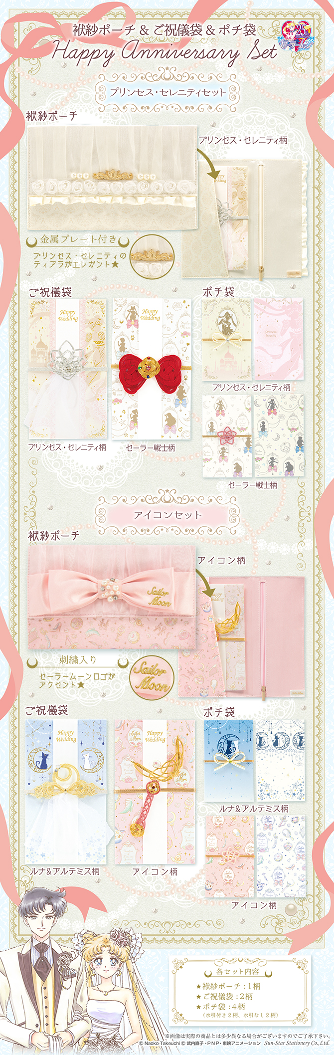 Z wersji z haftowanymi elementami do wyboru są wzory: Księżniczka Serenity & Książę Endymion, inner senshi oraz Chibi Moon & outer senshi.