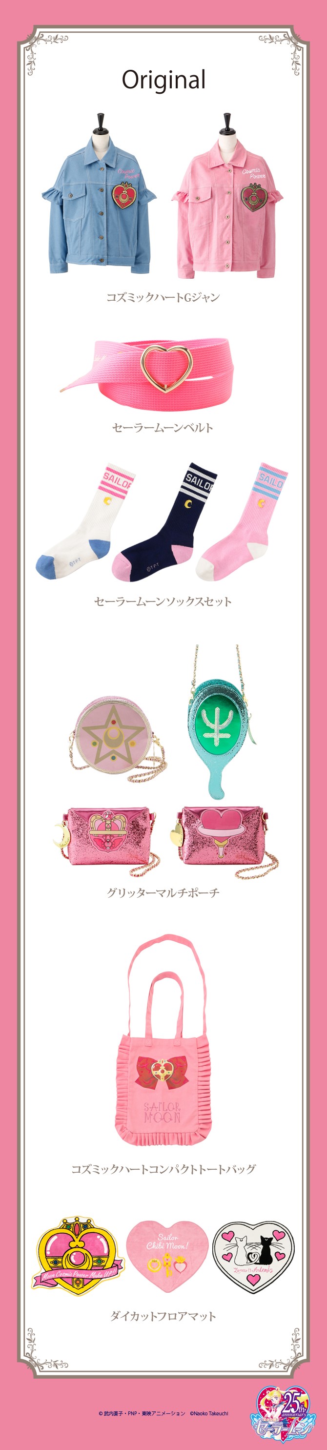 - Cosmic Heart G Jean - koszule stylizowane na jeansowe z aplikacją z broszką Cosmic Heart; do wyboru różowa lub niebieska; 19 440 jenów za parę (ok. 612 zł). - Sailor Moon Belt - różowy pasek z klamrą w kształcie serca; 5400 jenów