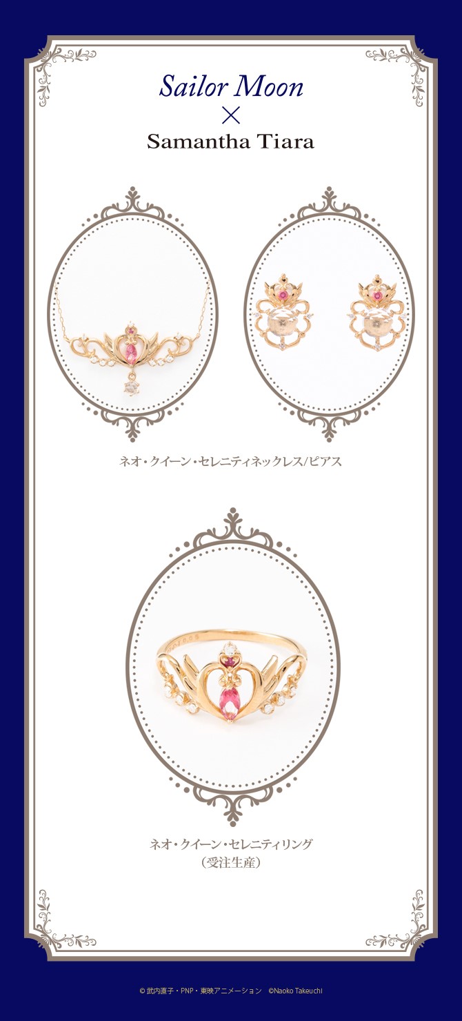 - Neo Queen Serenity Necklace/Pierce/Ring - naszyjnik, kolczyki i pierścionek z motywem diademu Nowej Królowej Serenity; naszyjnik kosztuje 102 600 jenów (ok. 3211 zł), kolczyki 89640 jenów (ok. 2806 zł), a pierścionek 75600 jenów (ok. 2366 zł)