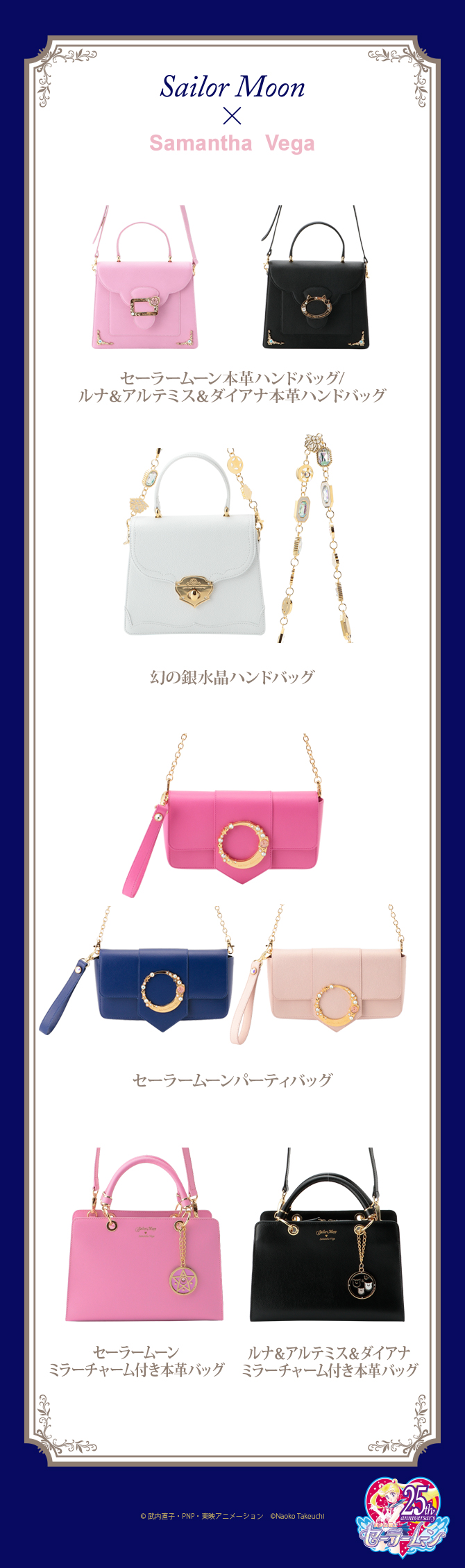 łańcuszkami na ramię; do wyboru wzory Crystal Star Compact, Deep Aqua Mirror, Eternal Sailor Moon i Chibi Chibi; dwie pierwsze są w cenie 9180 jenów za sztukę (ok. 289 zł), a pozostałe dwie w cenie 7344 jenów za sztukę (ok. 321 zł). -