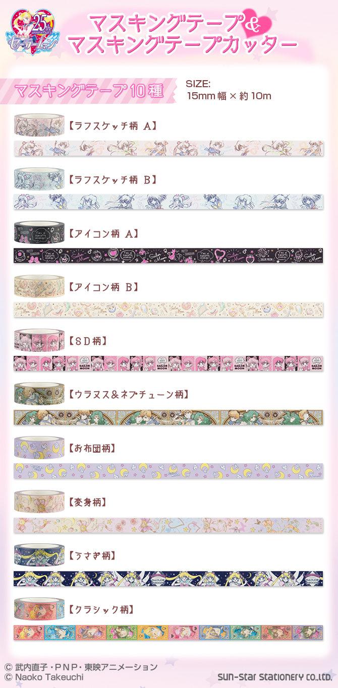 Taśmy ozdobne są szerokie na 15 mm i mają długość 10 metrów. Do wyboru jest 10 wzorów: szkicowany A (inner senshi) i B (outer senshi), magiczne przedmioty A (na czarnym tle) i B (na białym tle), z postaciami w wersji SD, z Uranus i Neptune, z pościelą
