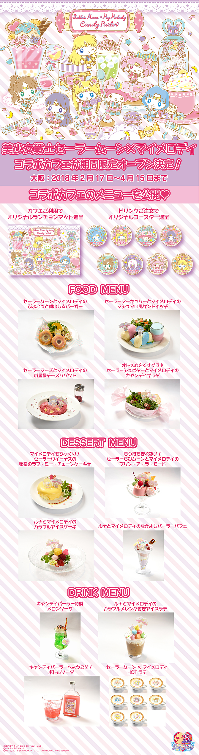 Od połowy lutego zostaną otwarte kawiarnie we współpracy Sailor Moon z My Melody. Kawiarnie będą otwarte w Osace, Sapporo Tokio i Nagoi. W Osace 50 fanklubowiczów będzie mogło odwiedzić kawiarnię dzień przed otwarciem. Osoby zostaną wylosowane w loterii.