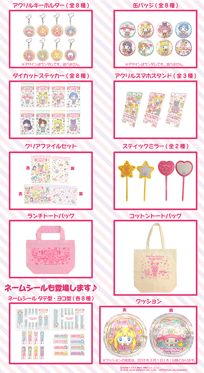 - akrylowe breloki - do wyboru 8 wzorów z inner senshi, Chibi Moon, My Melody i Luną; 400 jenów za sztukę (ok. 13 zł). - przypinki - do wyboru 8 wzorów z inner senshi, Chibi Moon z Luną, My Melody oraz Usagi z My Melody; 300 jenów za sztukę (ok. 9 zł). - naklejki - do wyboru 8 arkuszy z inner senshi, Chibi Moon, My Melody i Luną; 410 jenów za arkusz