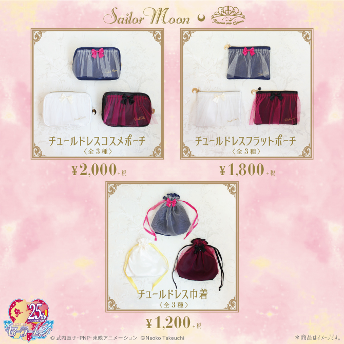 - Tulle Dress Cosmetic Pouch - kosmetyczki z tiulem na wierzchu z zaokrąglonymi rogami; do wyboru kolory: granatowy, biały i czarny z niebieskim, białym i bordowym tiulem; 2160 jenów (ok. 68 zł). - Tulle Dress Flat Pouch - kosmetyczki