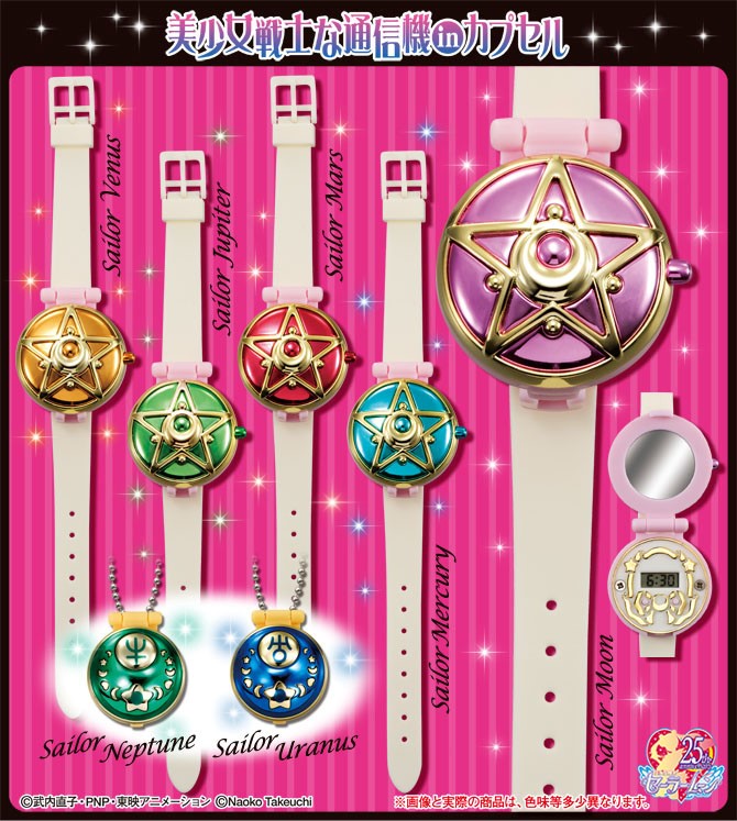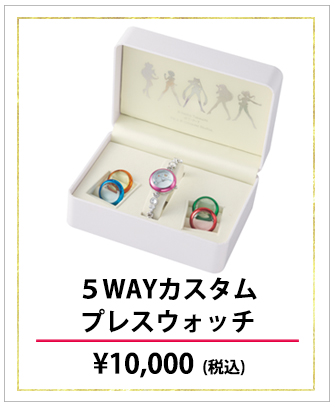 z Księżniczką Serenity - 33 000 jenów (ok. 1030 zł). - kolczyki z głową Luny i Artemisa - 1600 jenów (ok. 50 zł). - zegarek na rękę - w zestawie 5 wymiennych pierścieni okalających tarczę; pierścienie w kolorach inner senshi;