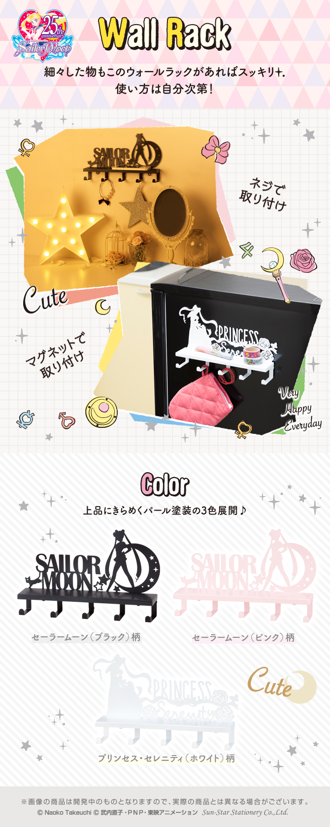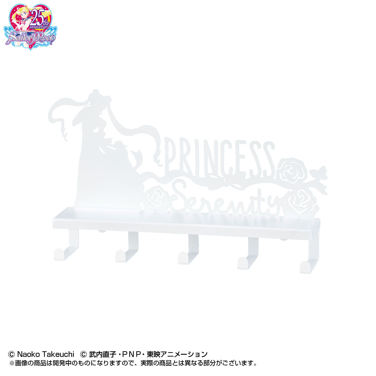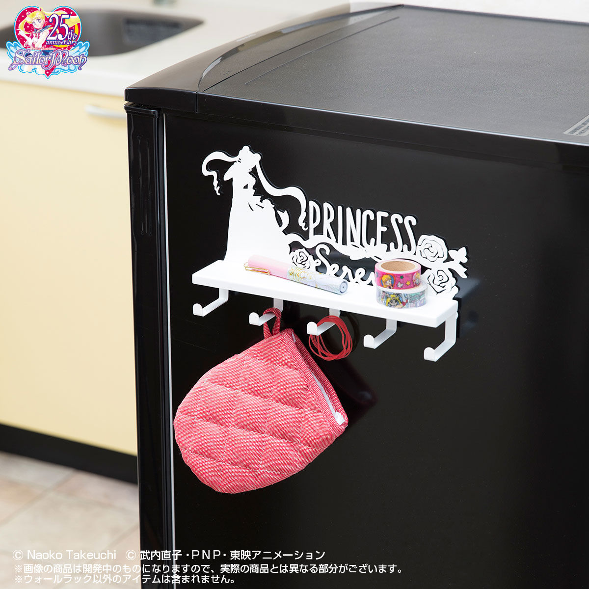 Półka na ścianę ma 5 haczyków, na których można powiesić różne rzeczy. Do wyboru są półki z napisem Sailor Moon w kolorach czarnym i różowym oraz biała z napisem Princess Serenity. Półki mają wymiary 250 x 157 x 50 mm i można je przymocować na magnesy