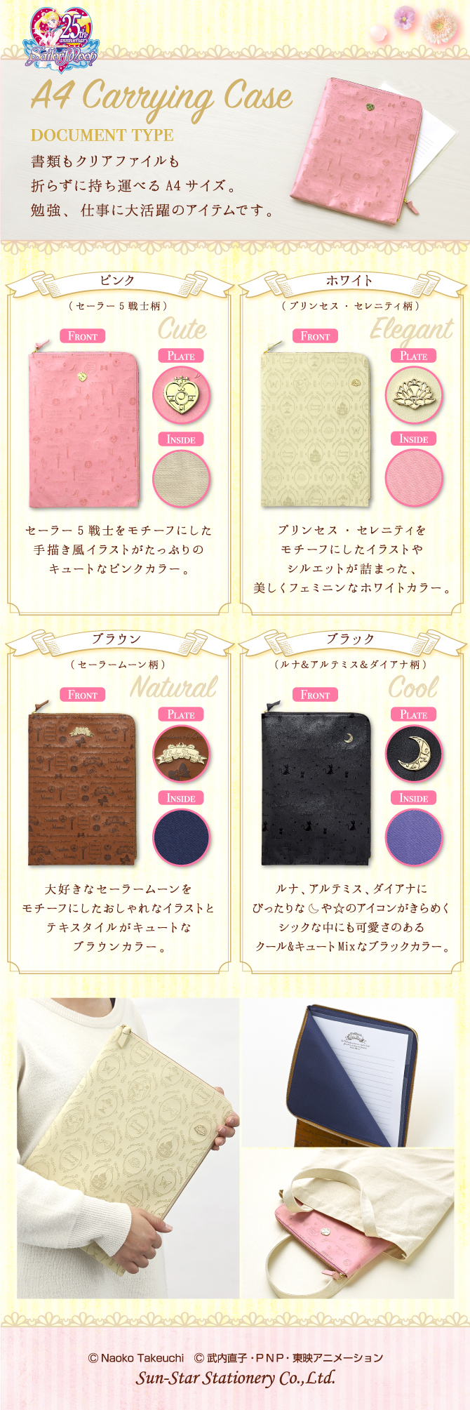 W sprzedaży pojawią się eleganckie teczki/futerały. Do wyboru wersja wszechstronna i na dokumenty. W obu przypadkach do wyboru są 4 kolory: różowy, kremowy, brązowy i czarny. Obie wersje są zasuwane na zamek błyskawiczny. Różowe są inspirowane inner senshi