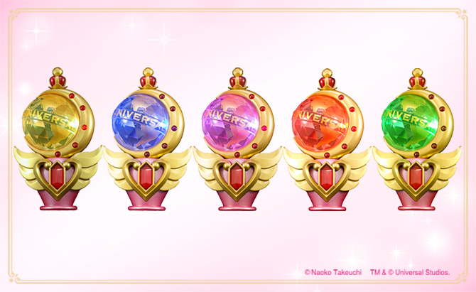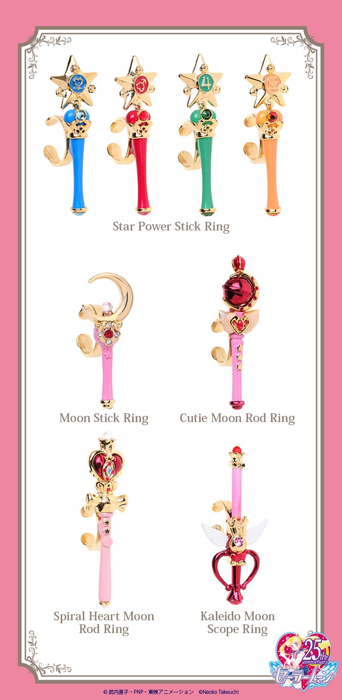 - Star Power Stick Ring, Moon Stick Ring, Cutie Moon Rod Ring, Spiral Heart Moon Rod Ring, Kaleido Moon Scope Ring - regulowane pierścionki z pałeczkami do przemiany i berłami; 18 280 jenów (ok. 555 zł) za sztukę.