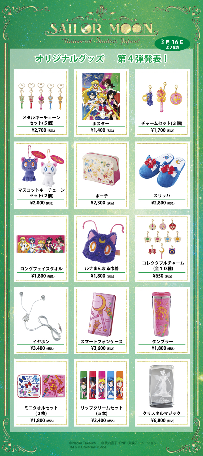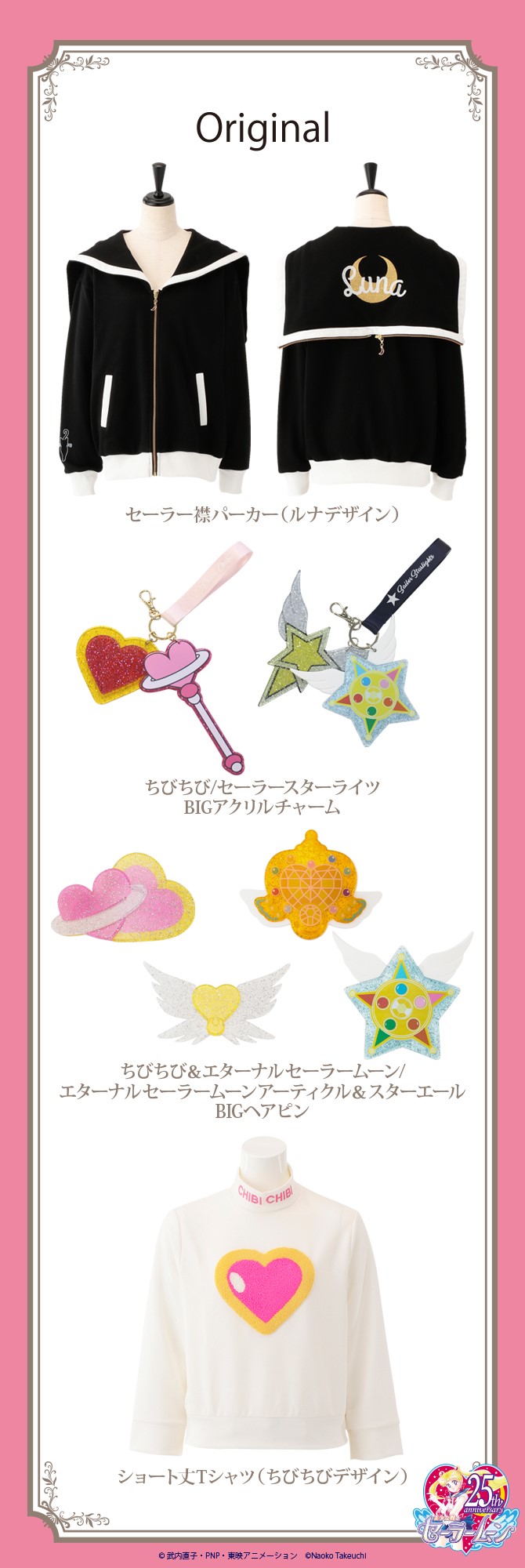 - Sailor Eri Parca - czarna bluza z kołnierzem; na kołnierzu wyhaftowany półksiężyc i napis Luna; 16 200 jenów (ok. 520 zł). - Chibi Chibi BIG Acrylic Charm / Sailor Starlights BIG Acrylic Charm - akrylowe zawieszki inspirowane