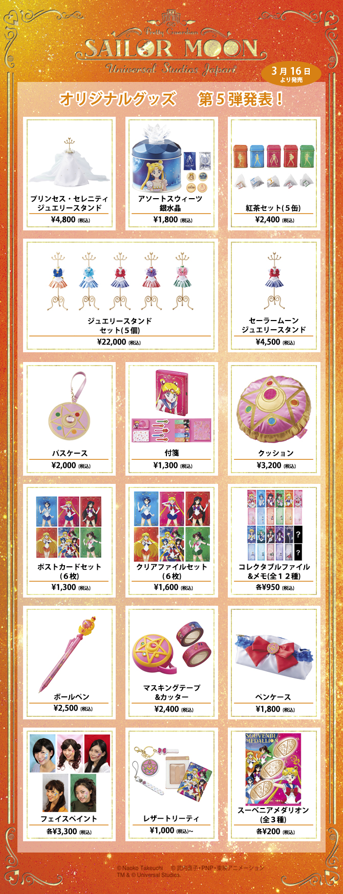 - 2400 jenów (ok. 77 zł). - zestaw stojaków na biżuterię w strojach inner senshi - 22 000 jenów (ok. 704 zł). - stojak na biżuterię w stroju Sailor Moon - 4500 jenów (ok. 144 zł). - etui na kartę,legitymację/itp. w kształcie