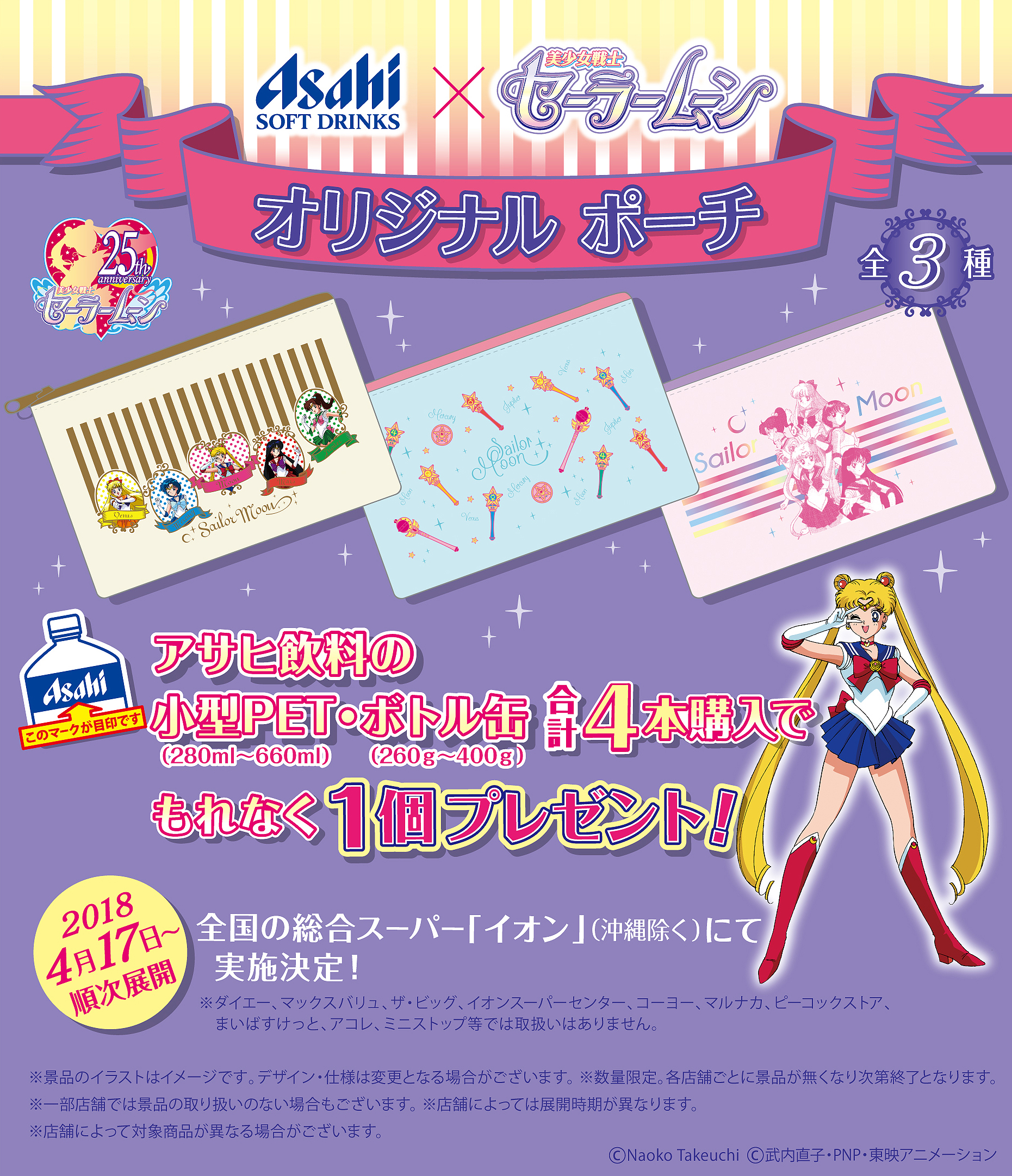 Przy zakupie 4 napojów o określonej pojemności od Asahi Soft Drinks będzie można otrzymać kosmetyczkę. Do uzbierania są 3 wzory. Kampania prowadzona jest w marketach Aeon i rozpocznie się 17 kwietnia.