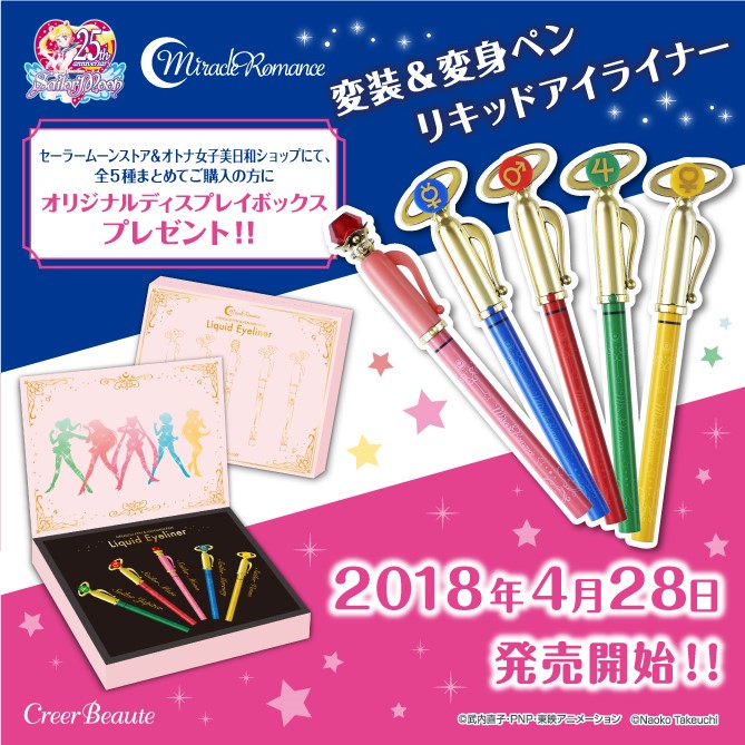 Płynne eyelinery w kształcie długopisów do przemiany pojawią się w sprzedaży 28 kwietnia. Osoby, które kupią wszystkie 5 sztuk w Sailor Moon Store lub Otona Joshi Biyori, otrzymają ozdobne pudełko. Należy się spieszyć, ilość pudełek jest ograniczona.