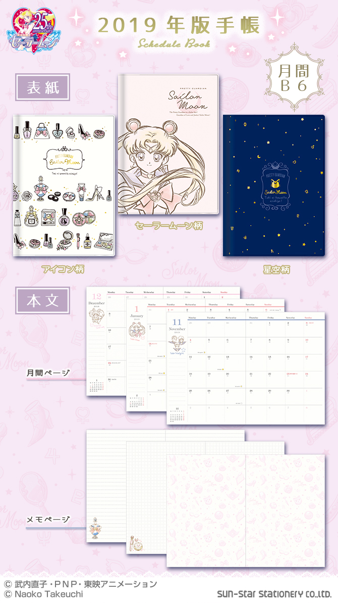 Terminarze będą dostępne w trzech wzorach: Icon, Sailor Moon i rozgwieżdżone niebo. Wszystkie w formacie B6. Wzory Icon i Sailor Moon mają winylowe okładki, a wzory Icon i rozgwieżdżone niebo ozdobione są złotą folią. Terminarze będą obejmować okres od
