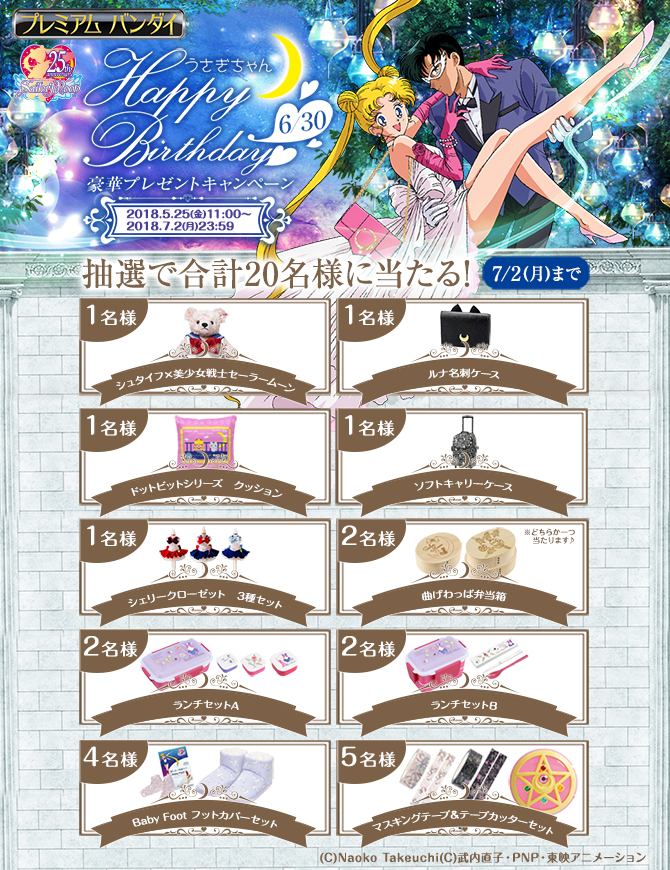Z okazji urodzin Usagi Premium Bandai zapowiedziało loterię z nagrodami, która rozpoczyna się dzisiaj i będzie trwać do 2 lipca. 20 osób, które wygrają w loterii otrzyma różne gadżety Sailor Moon. Do wygrania będą: