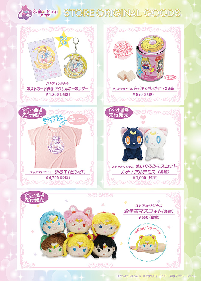 - maskotki Luny i Artemisa; wymiary to 100 x 60 x 70 mm; 1080 jenów (ok. 36 zł) za sztukę. - pluszowe piłeczki w formie głów inner senshi i Chibi Moon - wymiary to 80 x 55 x 50 mm; 702 jeny (ok. 23 zł) za sztukę.