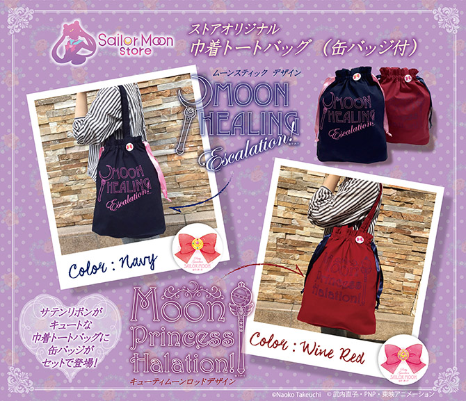 Jako ostatni oryginalny artykuł sklepowy dzisiaj zapowiedziano torby materiałowe z uchwytami na ramię, ściąganym na sznurek zamknięciem i metalową przypinką. Do wyboru kolor granatowy z napisem Moon Healing Escalation lub czerwony z napisem Moon Princess