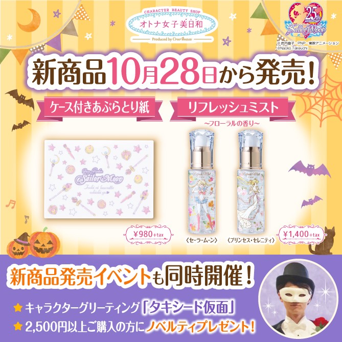 Od 28 października w Otona Joshi Biyori pojawią się bibułki matujące w opakowaniu z lusterkiem oraz mgiełki odświeżające. Oba kosmetyki mają zapachy kwiatowe. Mgiełki dostępne są ze wzorem Sailor Moon lub Księżniczki Serenity. Przy okazji premiery nowych