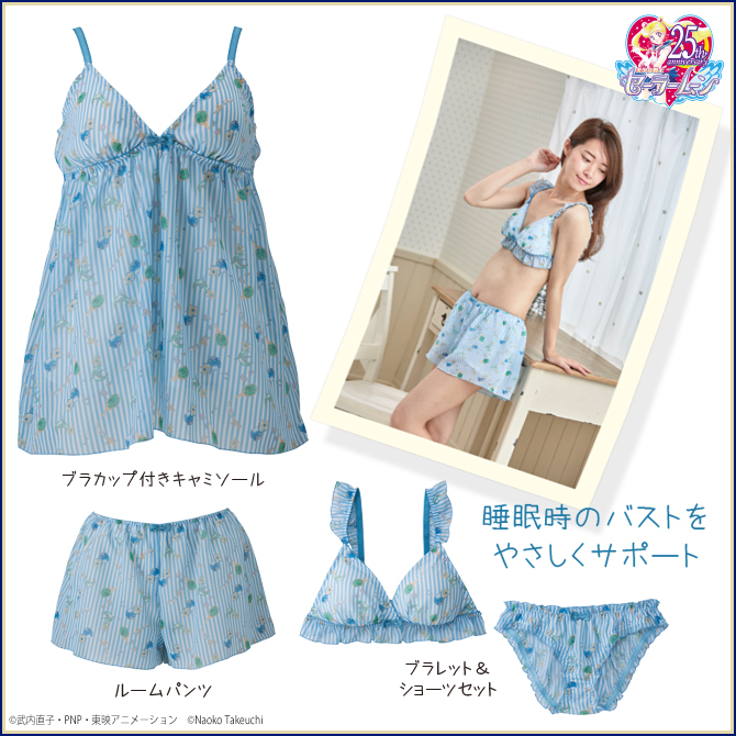 Pojawi się bielizna do noszenia po domu inspirowana Sailor Uranus i Sailor Neptune. Wykonana jest z materiału w niebieskie paski i z nadrukiem magicznych przedmiotów tych dwóch wojowniczek. Do kupienia będzie komplet biustonosz z figami, koszulka na ramiączka