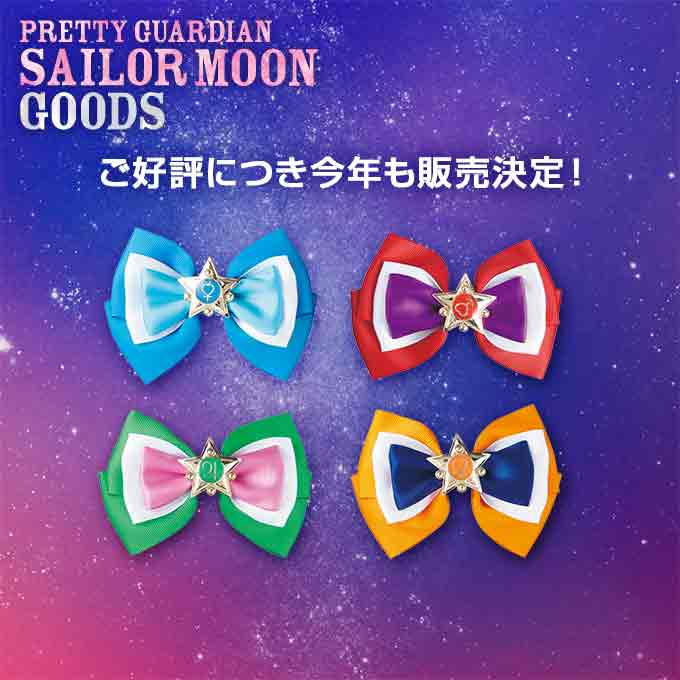 włosów w formie kokard z broszkami; do wyboru 4 kolory inner senshi (produkt z zeszłego roku), Sailor Moon z broszką Cosmic Heart, Chibi Moon, 4 kolory outer senshi oraz Princess Serenity; spinki z kokardami wojowniczek kosztują po
